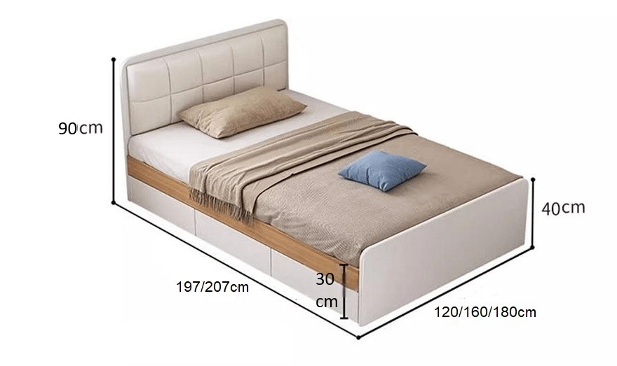 Về kích thước, giường có nhiều lựa chọn khác nhau để phù hợp với nhu cầu của từng khách hàng. Kích thước lọt lòng có các tùy chọn: Rộng 120-160-180cm x Dài 190-200cm x Cao 40-90cm. Kích thước phủ bì cũng tương tự với các thông số: Rộng 120-160-180cm x Dài 197-207cm x Cao 40-90cm. Điều này giúp bạn dễ dàng tìm được kích thước phù hợp với không gian sống của mình.