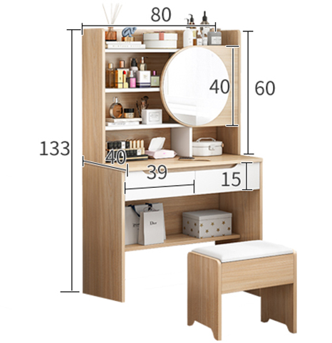 Kích thước của bàn rất hợp lý, với chiều rộng 80 cm, chiều sâu 40 cm và chiều cao 133 cm, phù hợp với nhiều không gian sống khác nhau, từ phòng ngủ nhỏ hẹp đến những căn phòng rộng rãi hơn. Đặc biệt, sản phẩm đi kèm với một chiếc ghế ngồi có đệm nhỏ gọn, tạo sự thoải mái tối đa cho người sử dụng khi trang điểm.