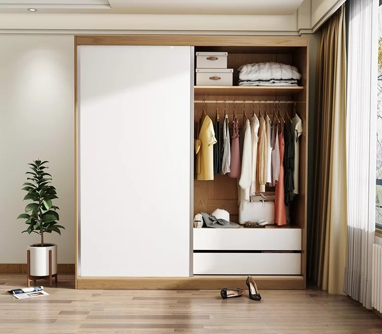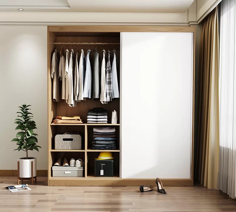 Tủ gồm 2 khoang lớn, khoang bên trái gồm 1 đợt cố định và 1 suốt treo quần áo. Khoang bên phải gồm 1 đợt, 1 suốt treo, 2 ngăn kéo để đồ