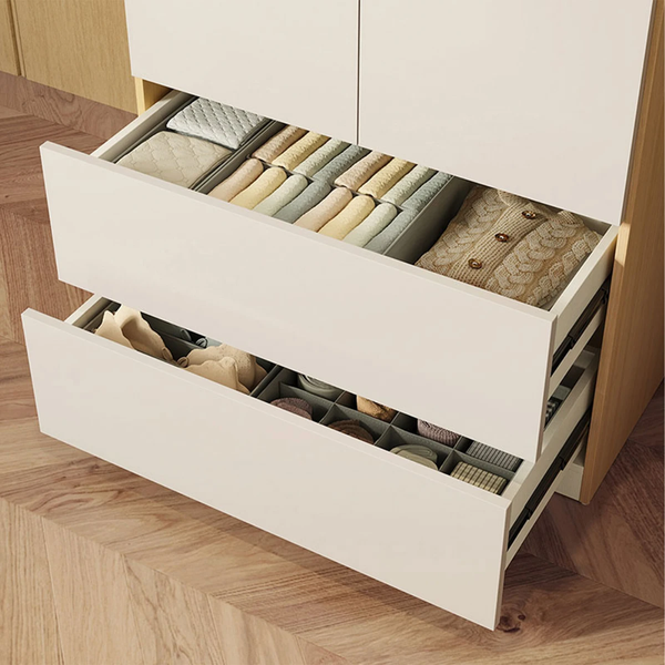 Đặc biệt, tủ còn được trang bị hai ngăn kéo tiện lợi, giúp người dùng dễ dàng bảo quản và lưu trữ các phụ kiện, đồ lót hay những món đồ cần thiết khác một cách gọn gàng.