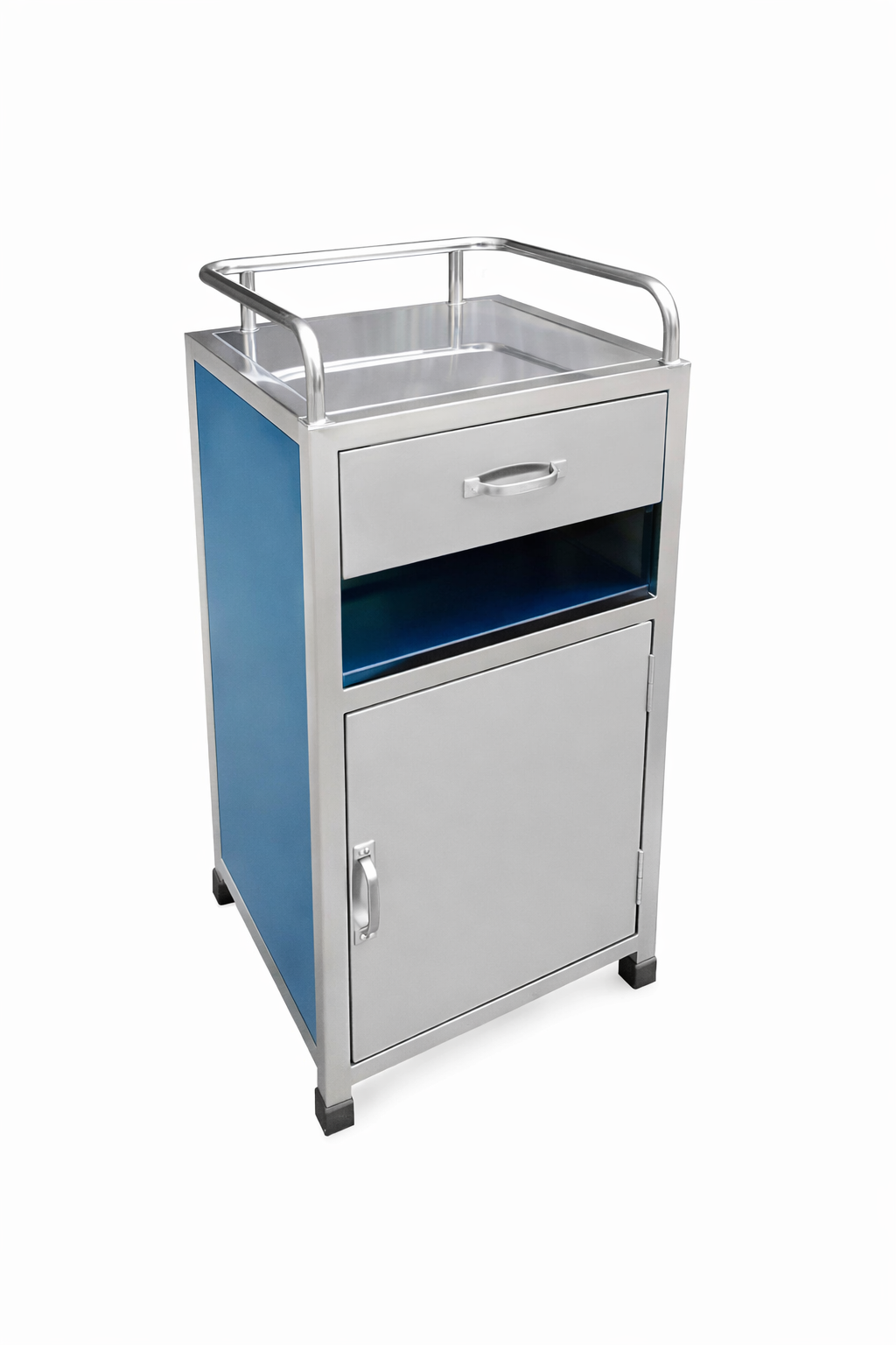 Thiết kế tủ gồm khay inox phía trên có tay chắn an toàn, ngăn kéo tiện lợi, khoang để đồ mở và cánh tủ phía dưới giúp sắp xếp vật dụng gọn gàng. Kiểu dáng nhỏ gọn, chắc chắn, dễ bố trí cạnh giường bệnh mà không chiếm nhiều diện tích.