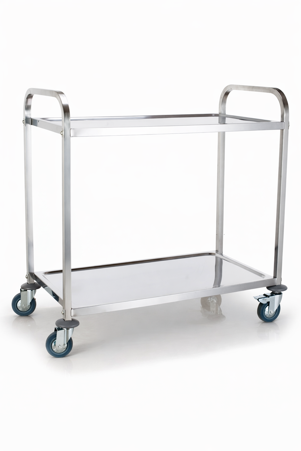Thiết kế 2 tầng rộng rãi giúp sắp xếp thuốc, bông băng, dụng cụ tiêm truyền gọn gàng. Xe được trang bị 4 bánh xe xoay linh hoạt, giúp di chuyển nhẹ nhàng giữa các phòng bệnh hoặc khu điều trị.